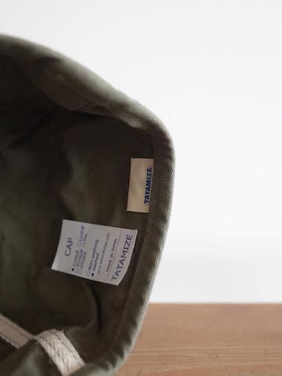 TATAMIZEのワークキャップは、タタミゼを代表するアイテム。デザイナーの八重畑さんがミシンを使用し、ひとつひとつ丁寧に製作されています。トップとツバ部分が一体化したデザインが特徴的で、他にはないタタミゼらしい雰囲気を持ったキャップです。こちらのオリーブは、生地にヘリンボーン柄のコットン素材を使用。1年を通してお使い頂ける生地感です。