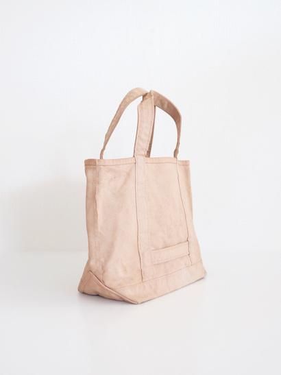 こちらはタンニン染めが施されたオープントート。通常、革は太鼓とよばれる大きな木の樽の中に、タンニンの液と原皮を入れてなめされます。その中に革ではなく、キャンバスのバッグを入れたらどうなるのか。そう言った考えのもとに誕生したバッグです。肌色のような色合いが時間とともに濃くなり、味わいのある飴色へと変化していきます。