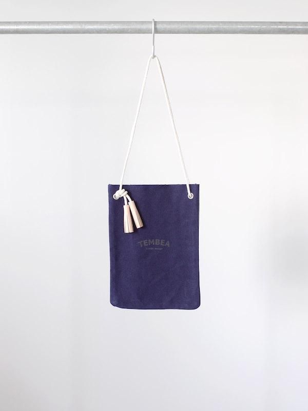 マチのない2つの袋の間にはポケットがあり、こちらにスマートフォンを収納していただくことも。ショルダー部分は斜め掛け(襷掛け)でも使用することができ、ふたが無いので鞄をからったままでも物の出し入れが可能です。ショルダーの先に付いたレザーのタッセルや、LOGOシリーズならではの「TEMBEA」のロゴがポイントになっています。