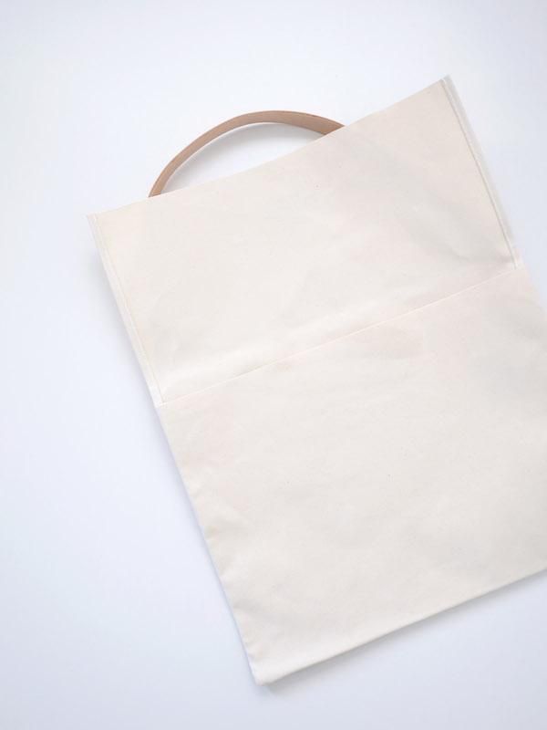 マチのないフラットな形のバッグ。レザーのショルダー部分は長さが調節できるので、肩掛けとして、または短くして手持ちのトートバッグとしてもお使いいただけます。