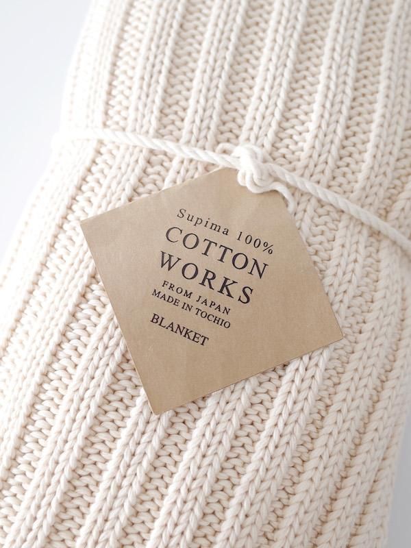 高級コットン「スーピマ超長綿」を使用し、素材本来の特性(柔らかさ・しなやかさ・光沢)を過加工せずに、できる限り自然に近い状態に戻すことをコンセプトに製作。このブランケットのために、新潟・栃尾で開発した糸で編みたてています。