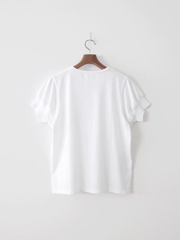 袖にギャザーが寄せられ、パフスリーブのような女性らしいデザインが特徴的な半袖Tシャツ。