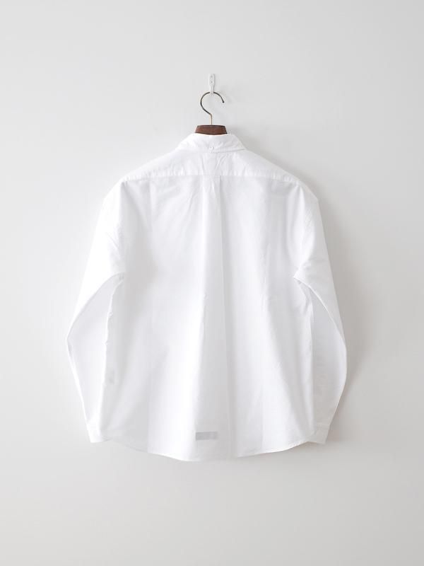フロントが「包みボタン」と「比翼仕立て」になった定番のボタンダウンシャツと比べ、こちらはフロントを「貝ボタン」で統一しています。シルエットも大きく異なり、肩幅・身幅がゆったりとしたシルエット。上品で清潔感のある印象はそのままに、より楽に着ていただけるのもこのシャツの特徴です。