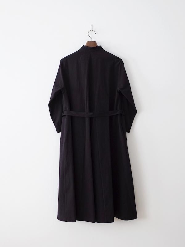 Atelier d'antanの「Eliot(エリオット)」は、ワンピースと羽織りの2Wayで着用できる使い勝手の良いアイテム。ウエストには取り外しが可能な共布の紐が付いており、この紐を使ってAラインの綺麗なルエットやギャザーの入った女性らしい表情を楽しむことができます。小さく立ち上がったスタンドカラーに、同じく小さなフロントのボタン、そしてこちらは大きな左胸のポケットがデザインのアクセントに。古い織機で丁寧に織られたコットン素材は、程よいハリがありながらも肌触りやわらかく、これから着込むほどにさらに風合い良く育っていきます。