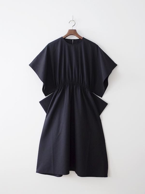 homspun ウールトロピカルクロス ワイドスリーブギャザーワンピース ブラック
