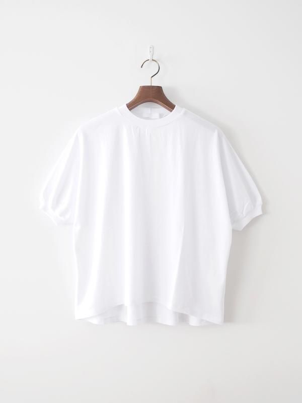 身幅を広くとったゆとりのある着心地、パフスリーブのような袖のディティールが特徴的な半袖カットソー。ゆとりがありとても着やすいですが、やや短く設計されたフロントの着丈によって野暮ったくならず、スッキリとした印象です。ふくらみのある袖も甘くなりすぎず、シルエットやデザインなどhomspunらしいバランスの良さが随所にひかります。60番手の糸を2本取りして編み立てた生地は肌触り優しく、リブの締め付けもなく着用できます。