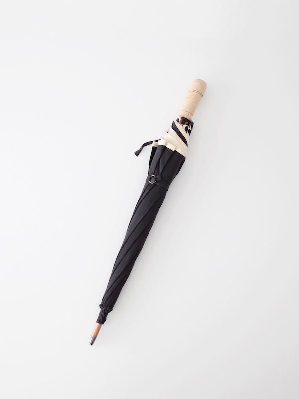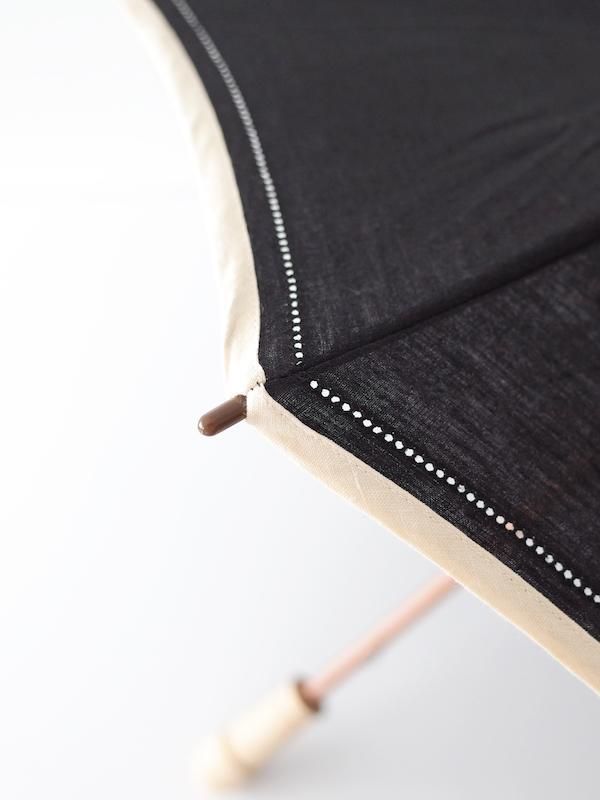 パイピングや刺繍が施された風合いの良いリネン生地、使うほどに色艶が増していく樫材の持ち手、貴重なデッドストックを使用した露先など、そのひとつひとつに拘りが感じられるアトリエ・ダンタンの日傘。やや小ぶりなサイズ感で持ち運びがしやすく、そのデザインや配色の良さから閉じた状態の姿でさえも愛らしいです。