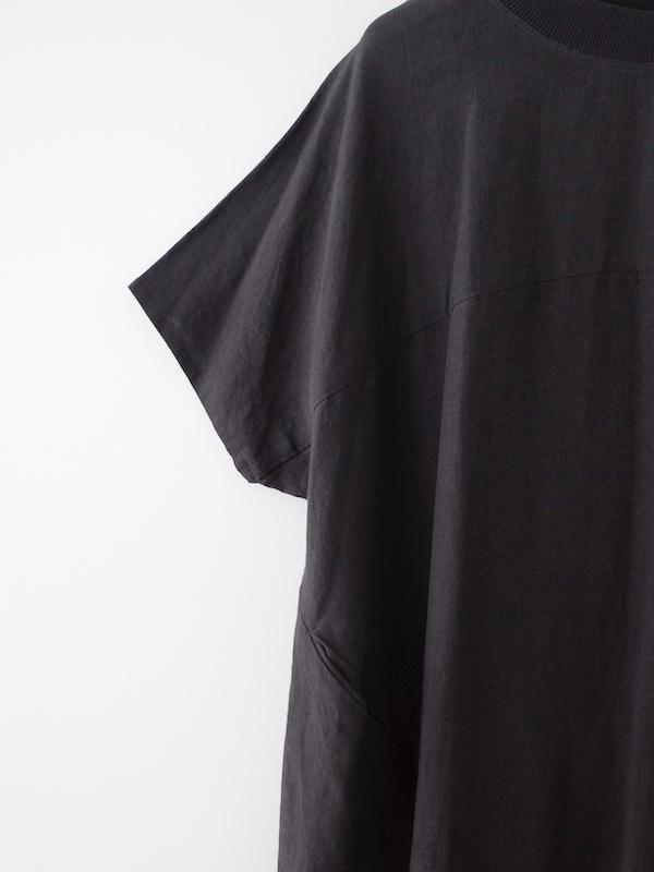 アトリエ・ダンタンのTaafee(ターフェ)は、首元がリブ仕様のAラインワンピース。一見シンプルなワンピースながら、両サイドのポケット位置から裾の中央にかけて生地の組み合わせがあります。これは切り替えのデザインとしてアクセントになるだけでなく、立体的なシルエットになるよう考えて仕立てられたもの。加えて、幅のある緩やかなAラインには綺麗なドレープが入るので、広がりすぎずに上品な印象でゆったりと着用いただけます。こちらの生地にはさらりとした肌触りのリネン素材を使用。程よいハリと厚みのある風合いの良い生地感です。