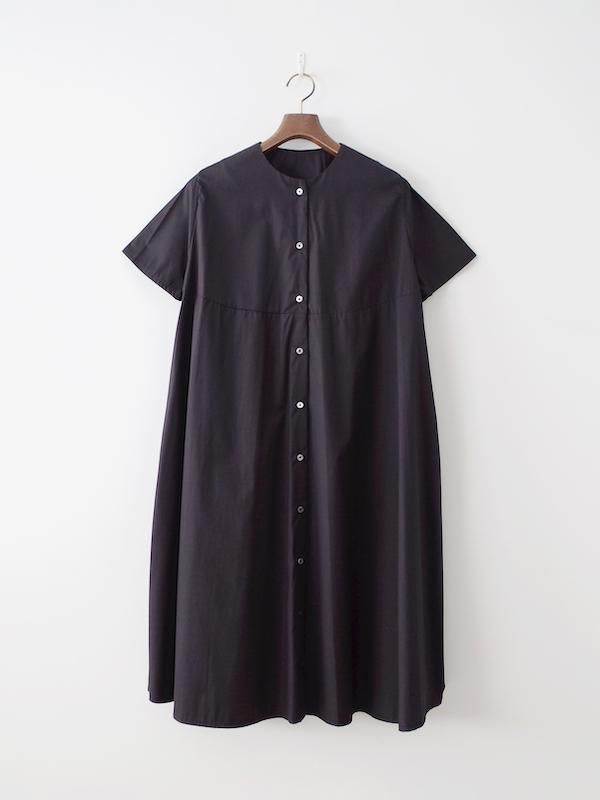 コットンブロードを使用したノーカラー半袖ワンピース。やや高めの位置にウエストの切り替えがあり、この切り替えからほんのりギャザーが入ります。肩幅やアームホールはややスッキリとしていますが、切り替え位置から裾にかけては大きく広がるAラインのシルエットを採用。程よいボリュームでふわりと膨らみ、動くたびに揺れる裾が女性らしさをより引き立てます。