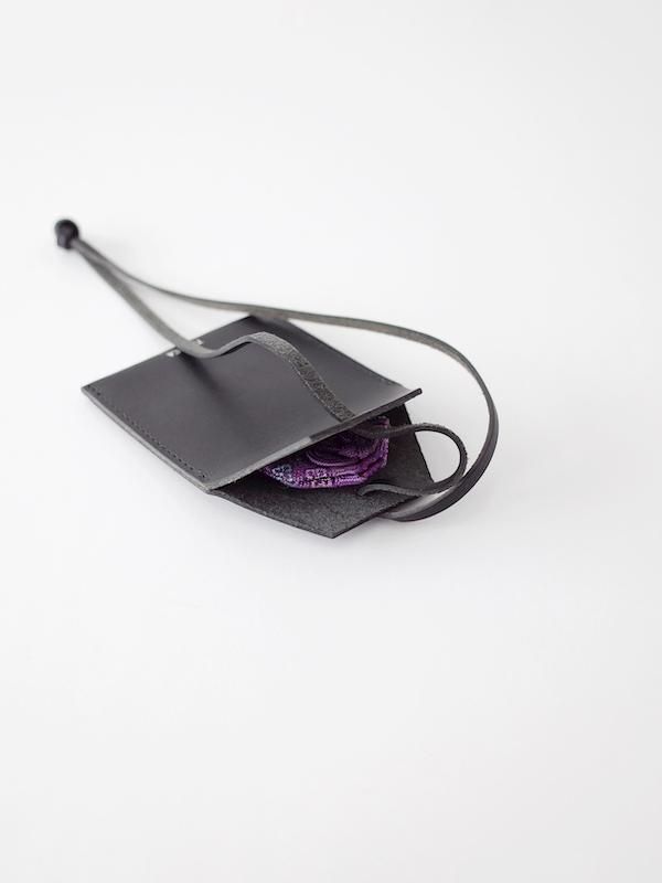 その名の通りお守りを入れるためのケース。お守りにも種類があり、中には他の人に見られると恥ずかしいものもありますよね。そういったお守りをケースに入れてスマートに持ち運んだり、大事なお守りが汚れるのを防ぎ、綺麗な状態をより長く保つことができるアイテムです。ヌメ革の生地に小さく入ったロゴが箔押しになっているのもポイント。ストラップをバッグのハンドルに巻き付けて持ち運ぶこともできます。