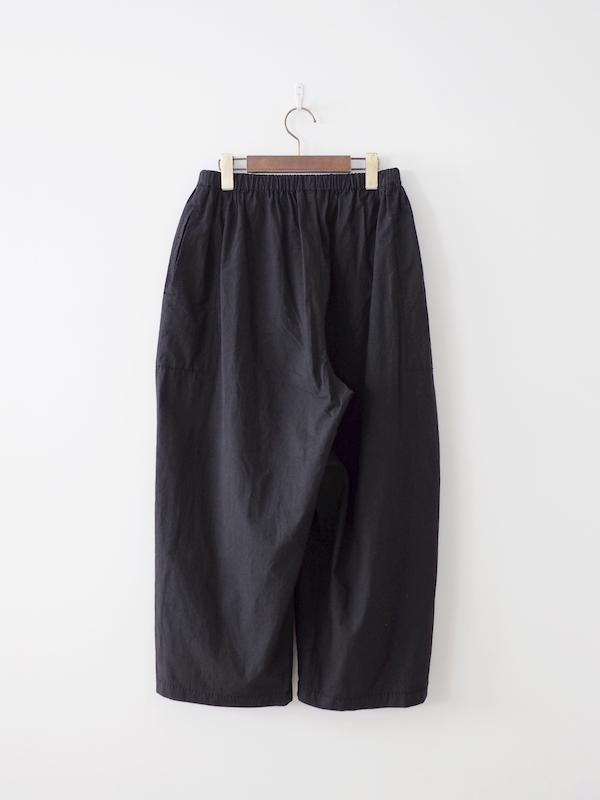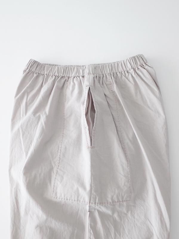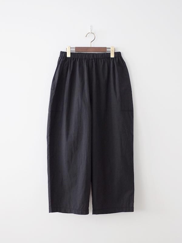 程よいハリと軽さのあるコットンバルキーシーチングを使用したイージーパンツ。ウエストがゴム仕様のディティールや、やや深めの股上、ヒップとワタリにゆとりを持たせたシルエットによってとても楽ちんな穿き心地。ひざ下から裾にかけてはほんのりテーパードが掛かっており、ゆったりとしていますが野暮ったくならず、少し丸みを帯びたような愛らしいラインに。このラインと、裾幅が広くやや短めの丈感とのバランスの良さが絶妙なんです。ウエストやポケット、裾などに施されたhomspunではお馴染みの0番ステッチもポイントに。暑い夏にも穿けて、スパッツなどのインナーを合わせれば春や秋の時期にも穿いていただけます。