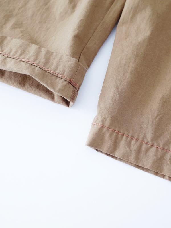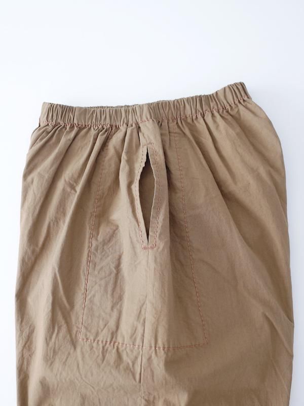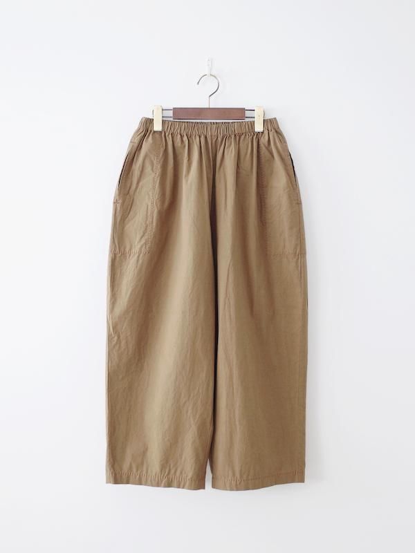程よいハリと軽さのあるコットンバルキーシーチングを使用したイージーパンツ。ウエストがゴム仕様のディティールや、やや深めの股上、ヒップとワタリにゆとりを持たせたシルエットによってとても楽ちんな穿き心地。ひざ下から裾にかけてはほんのりテーパードが掛かっており、ゆったりとしていますが野暮ったくならず、少し丸みを帯びたような愛らしいラインに。このラインと、裾幅が広くやや短めの丈感とのバランスの良さが絶妙なんです。ウエストやポケット、裾などに施されたhomspunではお馴染みの0番ステッチもポイントに。暑い夏にも穿けて、スパッツなどのインナーを合わせれば春や秋の時期にも穿いていただけます。