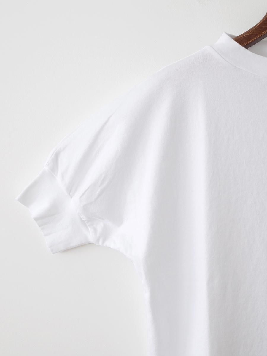 やや横に開いたハイネック、パフスリーブのような袖のディティールが特徴的な半袖カットソー。