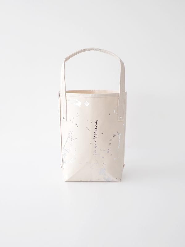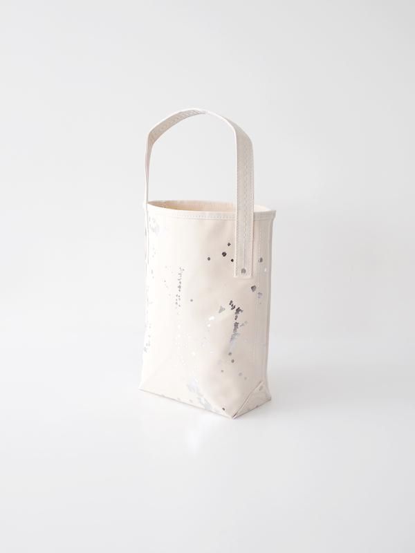 ペンキ屋さんが使うためのワンショルダーのトートバッグ。内側・外側ともにポケット等の付いていない縦長ボディのシンプルなデザイン。目を惹く箔シルバーのプリントは、実際に生地にペンキを飛ばし、データ化したものをプリントしています。生地のコットンキャンバスにはパラフィン加工が施され、一般的なキャンバス地よりも耐久性や撥水性に優れています。