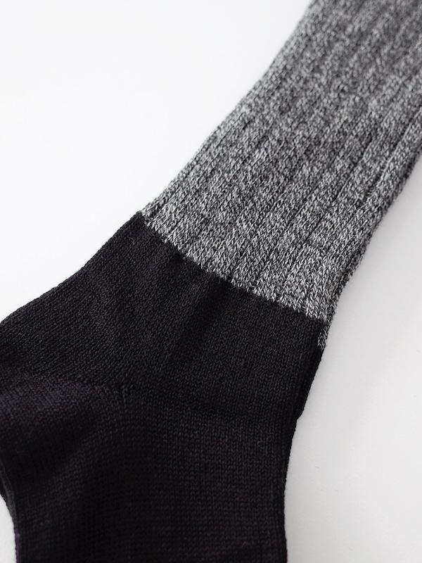 コットン・ウールが中心となったあたたかな履き心地と、2つの色からなる配色がポイントになったハイソックス。かかとから履き口まで約40cm程と長さがあるので、ふくらはぎまで保温し、やや厚手で伸縮性の良い生地が足にやさしくフィットしてくれます。配色ソックスはいろんなブランドやメーカーから展開されていますが、この靴下のように足首の少し上に配色部分があるのは意外に少ない気がします。こちらはブラックとブラック杢による落ち着いた色味の配色なので、合わせる服の色を選ばずに取り入れやすいです。