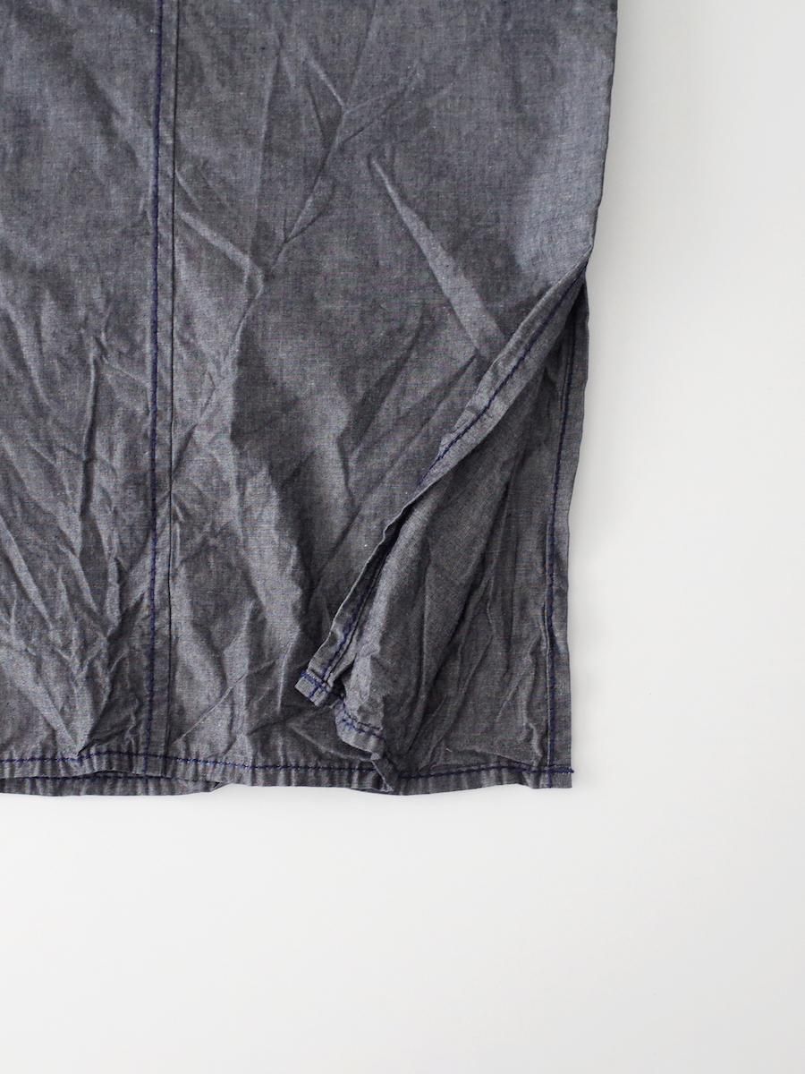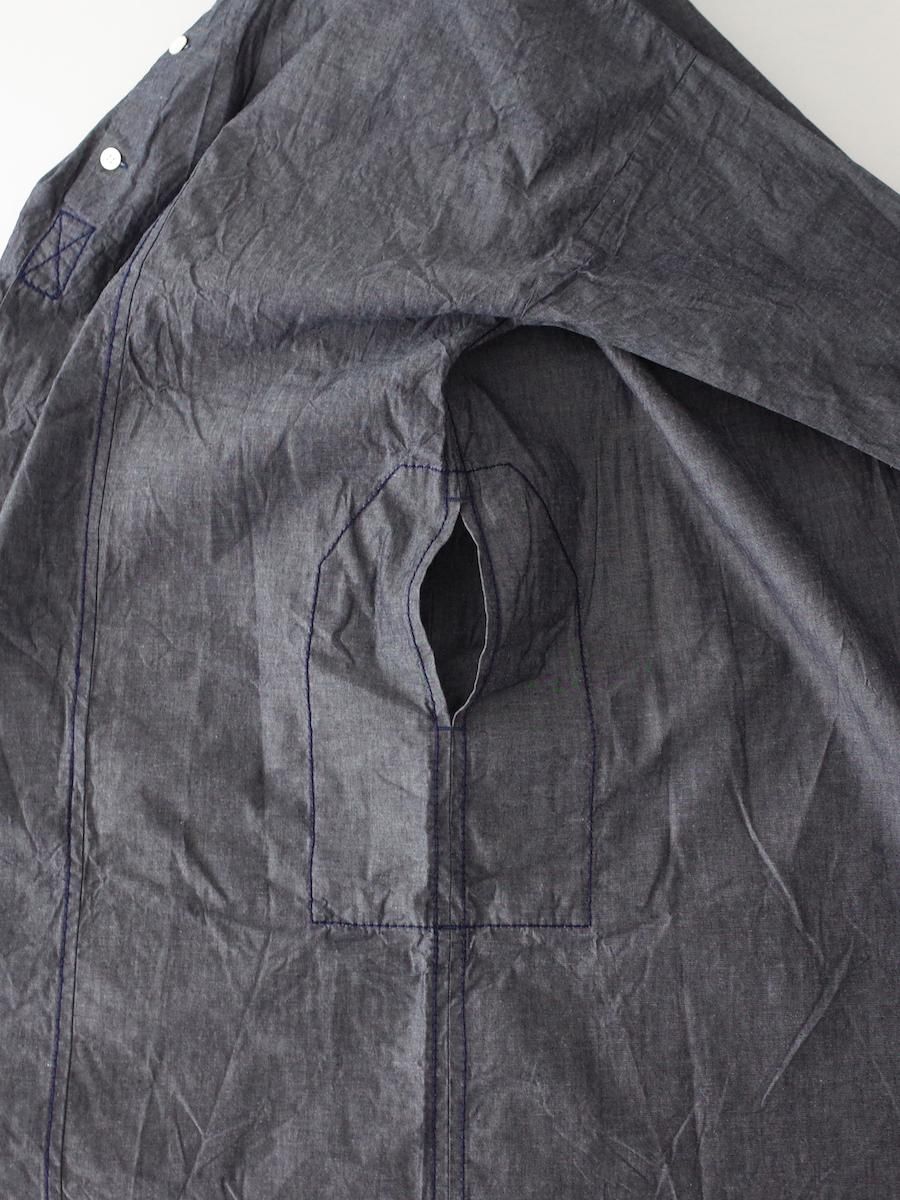 素材にはライトオンスのコットンシャンブレーを使用しています。程よいハリと光沢感のある生地。1年を通して着用することができ、着込むことでさらに風合い良くなります。
