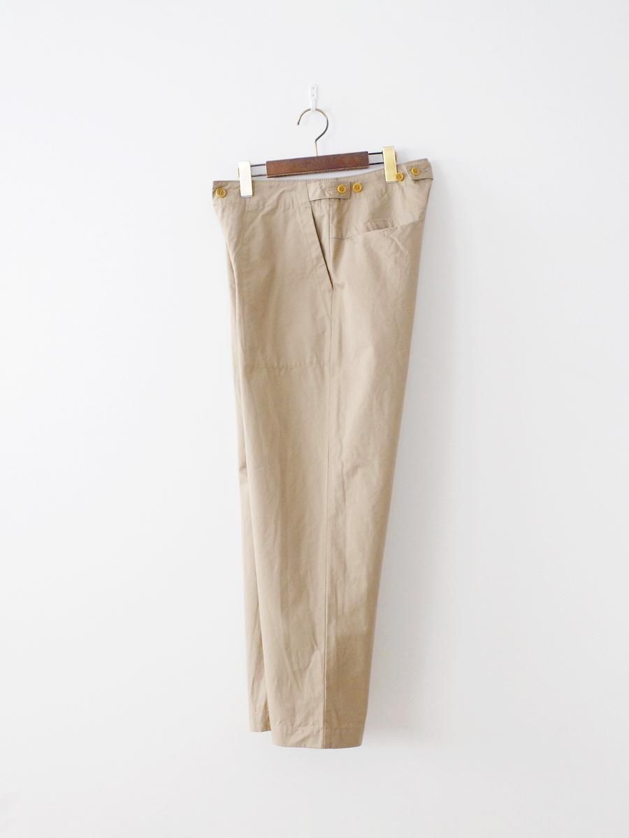ウエストボタンが特徴的なコットンウェザーパンツ。