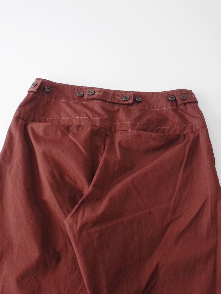 ベルトループがなく、ベルトが不要で、ウエストの左右と後ろに施されたアジャスターボタンでサイズが調節できる仕様です。フロントポケットはベイカーパンツに見られるような大きめのポケットを採用。バックは縫い目の見えないスッキリとした目立ちにくいポケットで、その上の太番手の飾りステッチやウエストボタンがより引き立つデザインです。