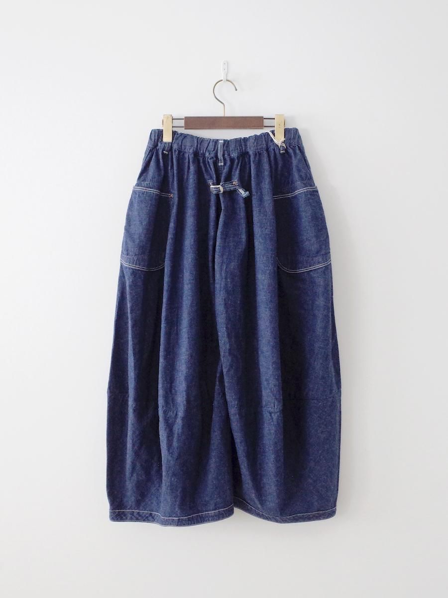 生地に使用したのはライトオンスのデニム地。くったり柔らかく、軽やかな着心地。通年使える生地感で、夏の時期にも穿いていただけます。青味の強い色合いで、シンプルに白いTシャツやシャツと合わせても素敵ですし、穿き込むことでよりデニムの味わい深い色落ちを楽しめます。