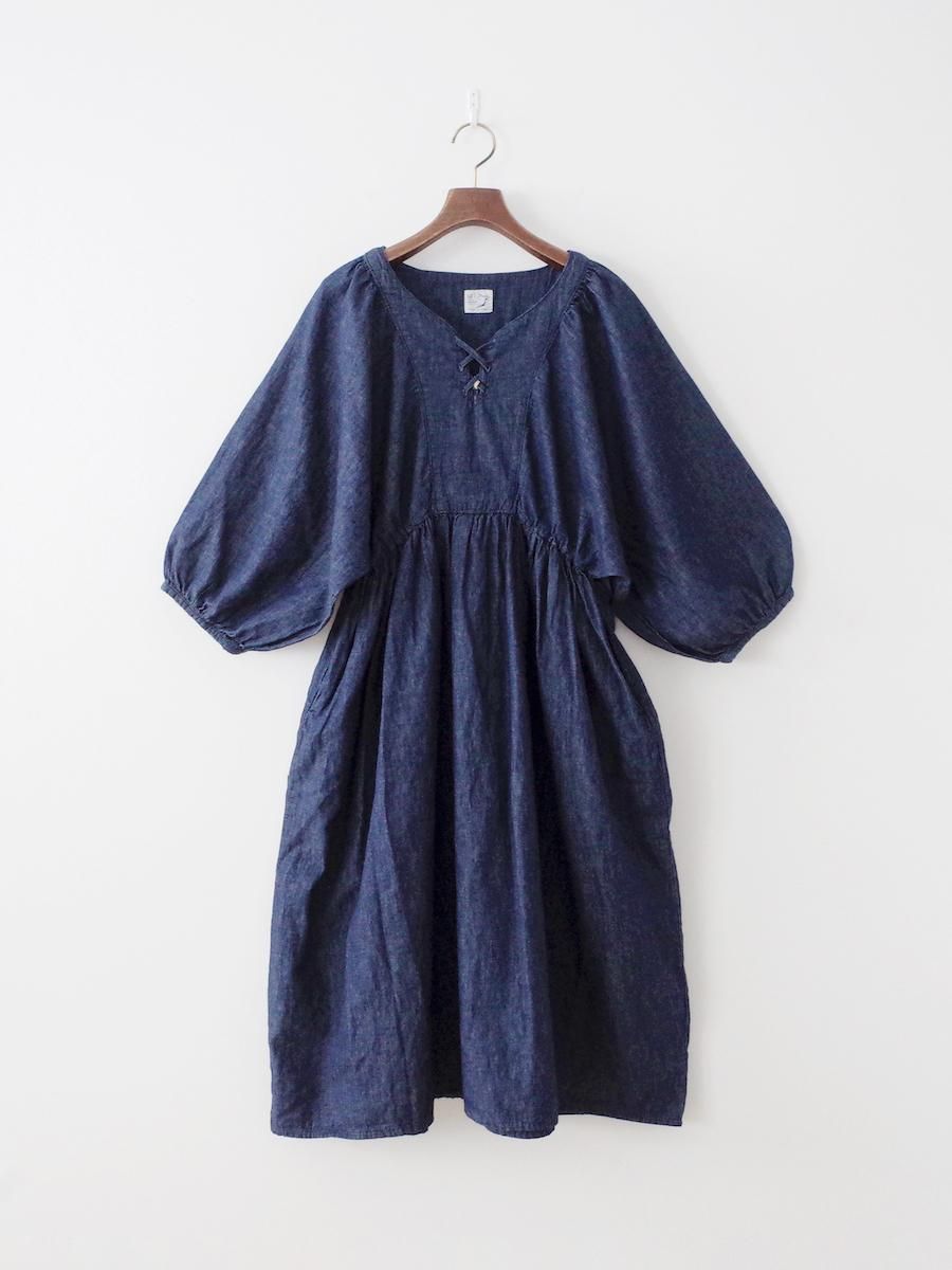 コットンリネンのライトオンスデニムを使用し、胸元のレースアップや、たっぷりとボリュームのある袖のデザインが特徴的な1枚。ウエストギャザーによって作られるドレープもポイントで、このドレープが女性らしく華やかな印象を与えてくれます。