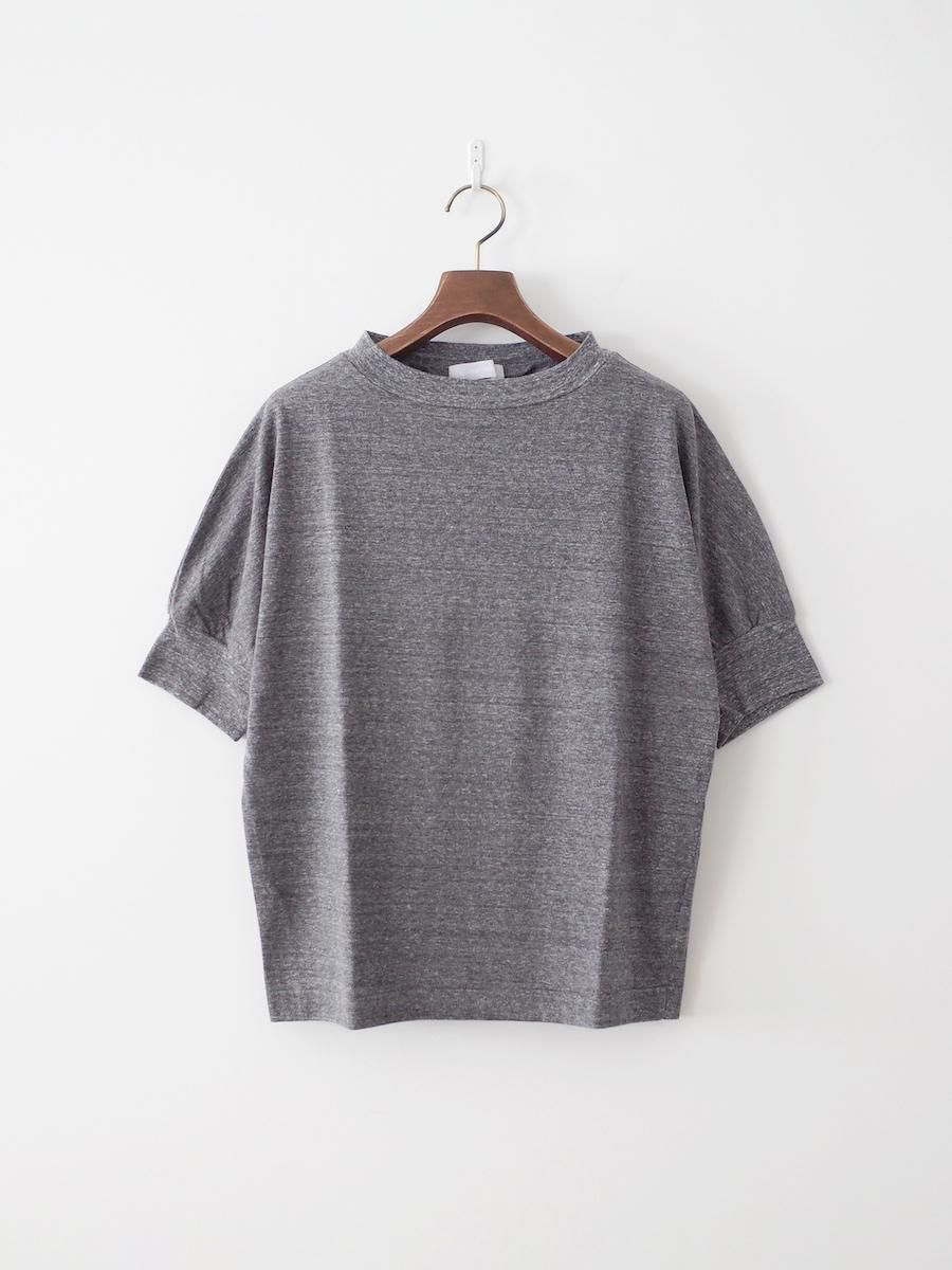 やや横に開いたハイネック、パフスリーブのような袖のディティールが特徴的な半袖カットソー。糸を2本どりして編み立てた40/2天竺素材を使用した生地は、適度に厚みがありながらも肌触りは柔らか。袖口のリブも柔らかな生地なので、腕を締め付けることなく着用いただけます。身幅にゆとりのあるシルエットで身体のラインが出にくいのも特徴です。