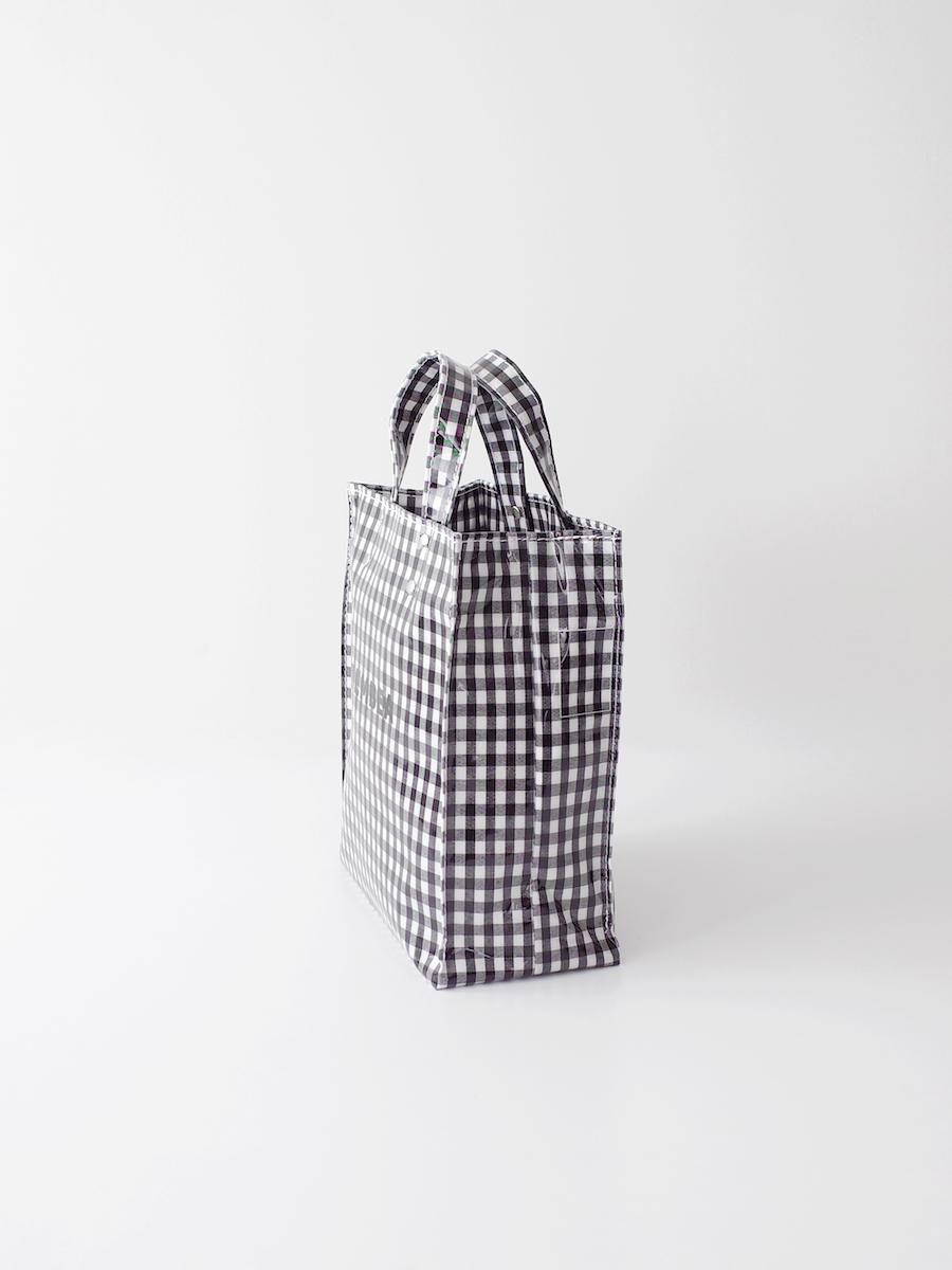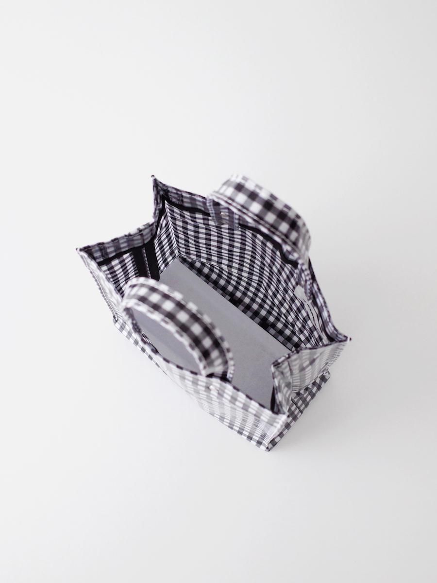 柔らかなギンガムチェックの生地にPVCコーティングを施した、ペーパートートのスモールサイズです。