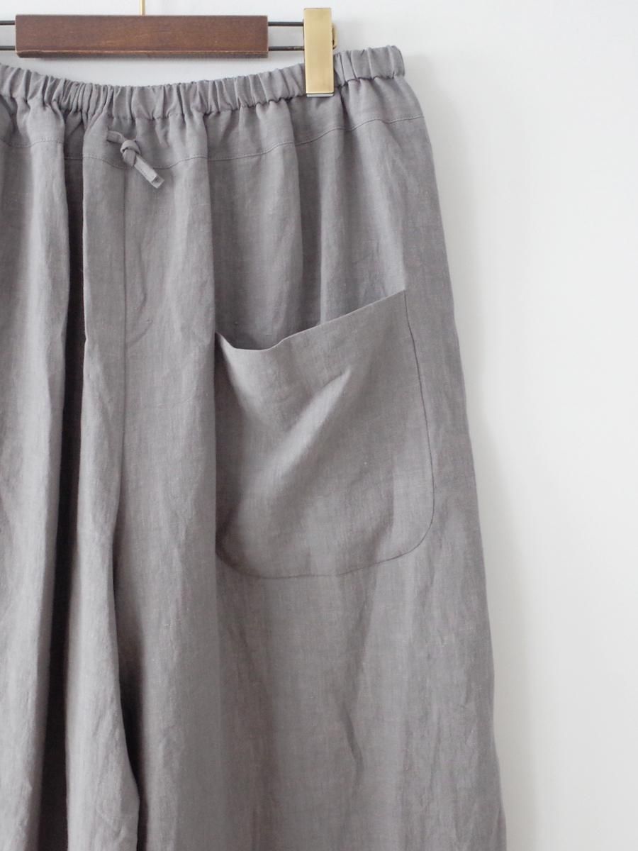 ウエストはゴムと紐でサイズ調整ができる仕様。股上は深めでヒップまわりにゆとりがあり、裾に向かってストンと落ちるワイドストレートのシルエットです。ワイドといっても広がり過ぎず、ゴーシュならではの立体的なパターンで形がとても綺麗に出ます。