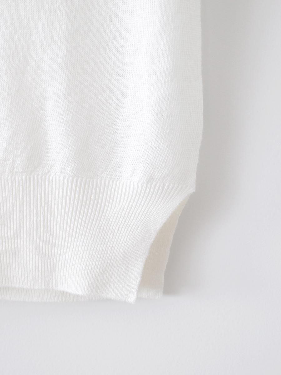 程よい深さと開きのあるVネック、肩幅をやや広くとった落ち感のあるショルダーライン、裾のリブに入った両サイドのスリットのデザインが特徴的。身幅がゆったりとしており、加えてアームホールも広めなので、インナーにボリュームのあるアイテムも着やすくなっています。