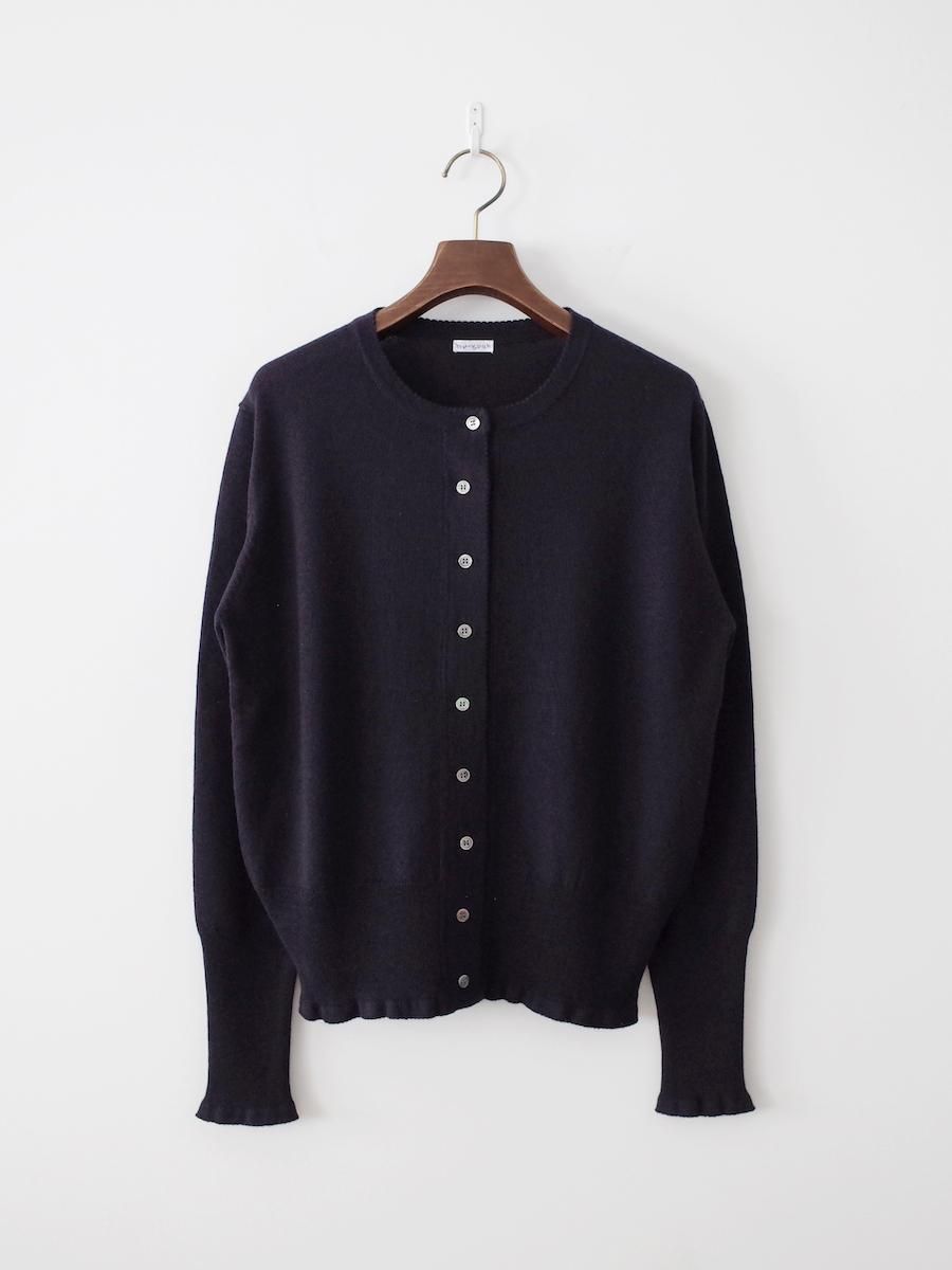 首元や前立てのさりげないスカラップ、裾や袖口のピコ編みがホームスパンらしいデザイン。長くとったリブもポイントで、着用時に弛む様子が愛らしく、どこかリラックス感のある印象です。