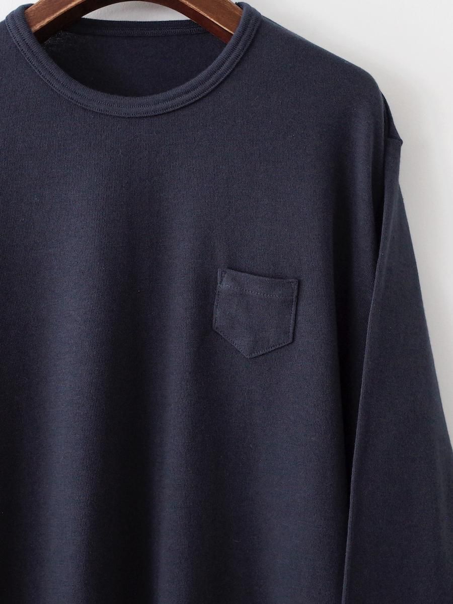 クルーネックのベーシックなデザインで、ゴーシュらしい左胸の小さなポケットがアクセントに。身幅を若干広くとっていますが、その他はスタンダードなサイズ感で全体的に綺麗なシルエットです。インナー使いから1枚での着用と、幅広い着こなしと長いシーズンで活躍します。