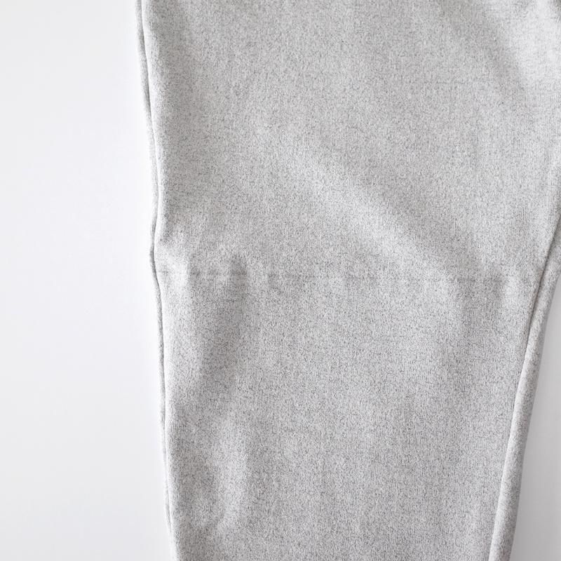 ウエストはゴムと紐でサイズ調整ができ、股上は深め。リラックスして穿けるイージーパンツながら、膝下から細くなったシルエットによってスッキリとした印象です。膝部分の内側には布帛の生地があてられ、膝が出にくいつくり。裾リブ仕様で動きやすく日常着としてはもちろんのこと、アクティブに行動するときや、長距離移動をするときにも重宝する1本です。