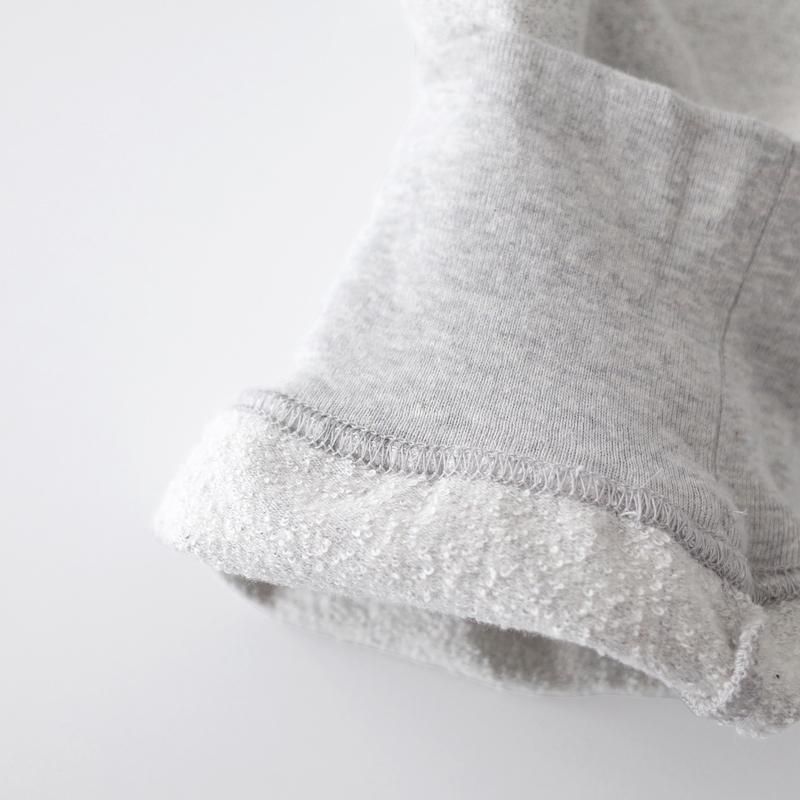 糸に余計なテンションをかけずに生地を編み立てることができる吊り編み機は、空気を含んだような柔らかな風合いが特徴。「吊り編み機」と聞くと、裏地がループ状で厚みのあるスウェット(裏毛)をイメーシされる方もいらっしゃると思いますが、こちらのパンツはループの出ない天竺編みを採用しており、やや薄手でサラッとした肌触りの生地に仕上げています。