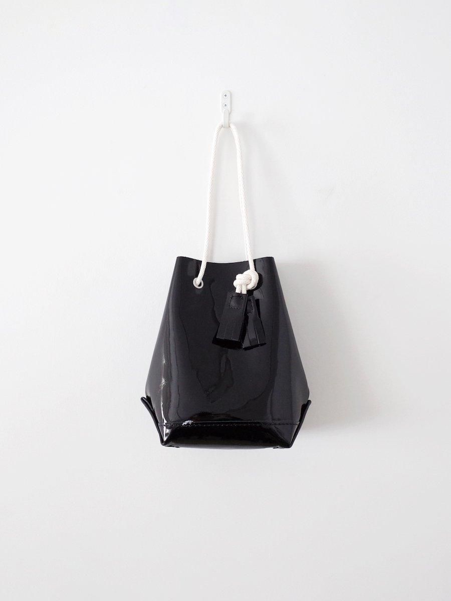 それで今回入荷したのは、底のマチが四角い巾着型のもの。生地にはエナメル加工が施された牛革を使用しています。水や汚れがついてもさっと拭き取ることができる手入れのしやすさであったり、経年変化が少ないため美しい表情のまま長く愛用できるという、通常の革とは異なる点も魅力です。