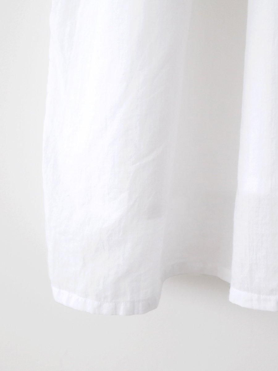 100番手の細い糸を使用し、高密度に織り上げた薄手の生地。とても滑らかな肌触りや、軽やかで上品な透け感が特徴です。ローン生地に透け感はありますが、裏地に同色系の綿生地が施されているので、下着の透けは気にせずに着用できます。ただ、こちらはカラーがホワイトなので、不安な方はキュロットなどを穿かれた方がより安心感があるかと思います。