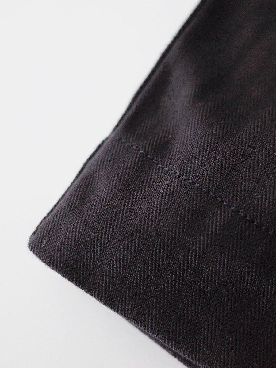 細かなヘリンボン織による表情豊かな生地。適度な厚みがありながらも肌馴染みが良く、穿き心地も程よく軽やか。日光や洗濯による色落ちが少なく、摩擦にも強いスレン染が施されているので、日常着として1年を通して活躍します。