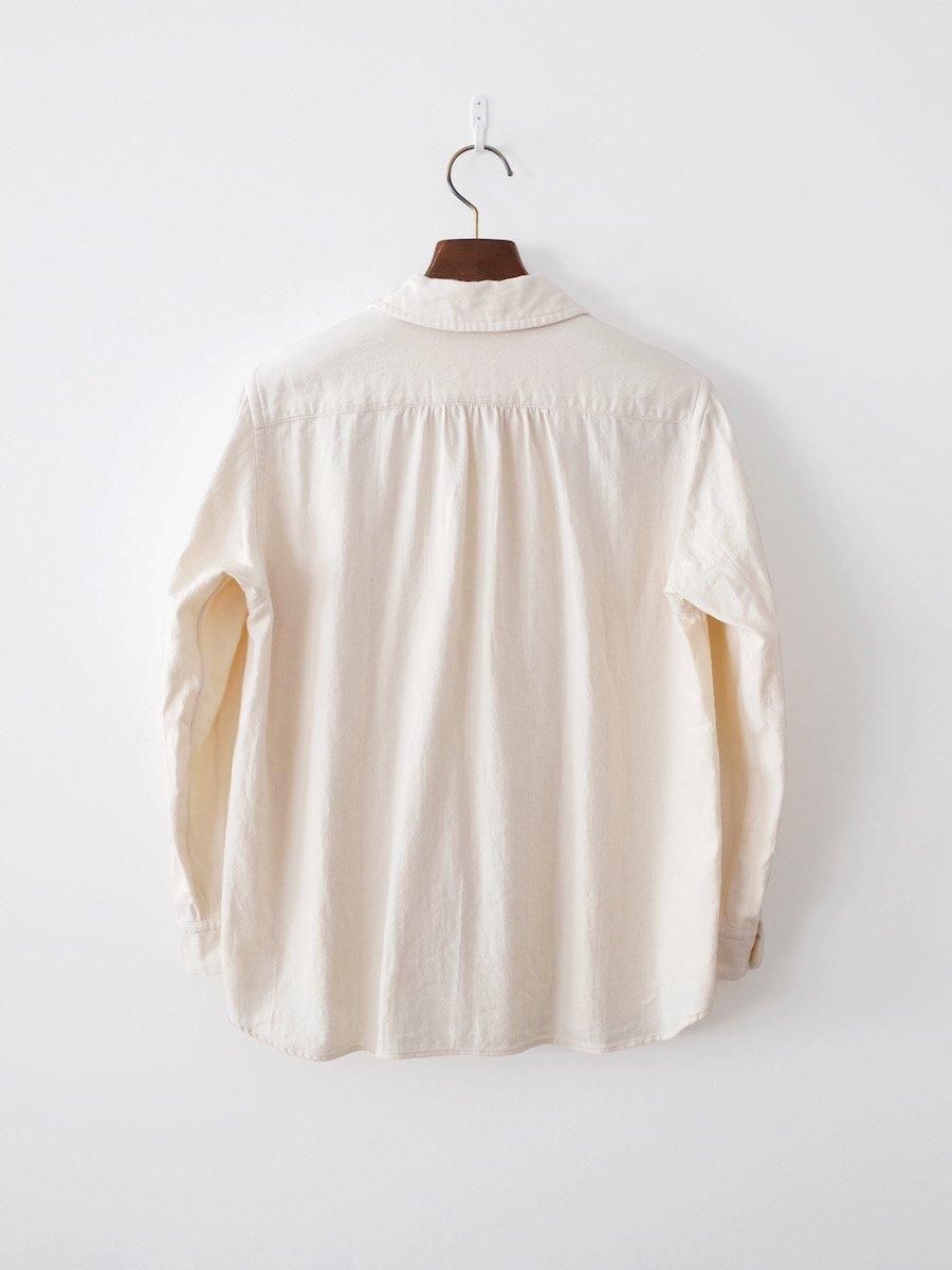 デザイナーの泉さん曰く作業がしやすい!とのことで、以前から8分袖のシャツやブラウスの製作を考えていたそうですが、この度ようやく製品化に。8分袖に合わせて丈の長さも少し短く(定番のブラウスよりも3cm程短く)設計し、ややコンパクトなサイズ感ながらもバランスの取れた1枚に仕上げています。