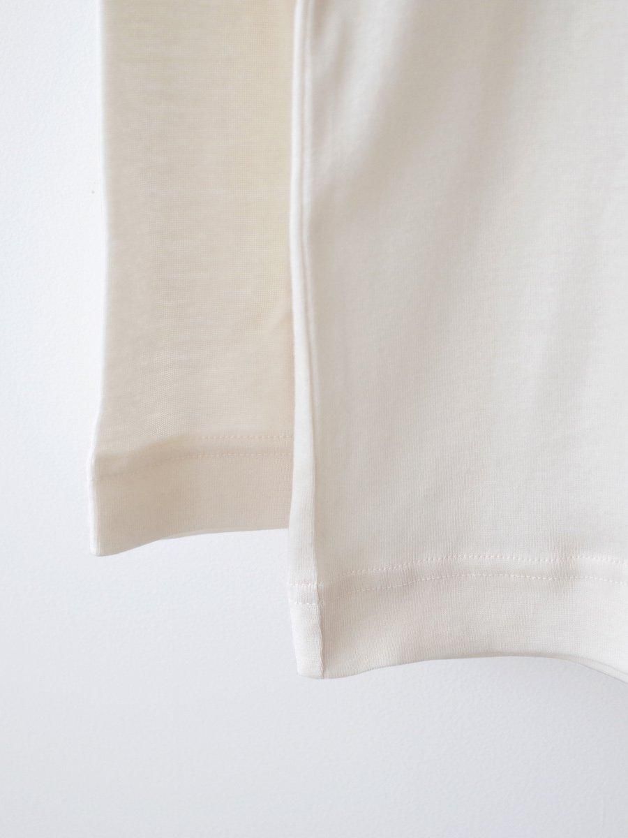 60番手の細い単糸をフライス編みにて編み上げた、薄手でとても柔らかく、横方向によく伸びる伸縮性に優れた生地。表裏の編み目が同じ形状なのもフライス編みの特徴で、肌に直接ふれる裏面も滑らかな肌触り。着心地よく、身体を締め付けずにやさしくフィットします。