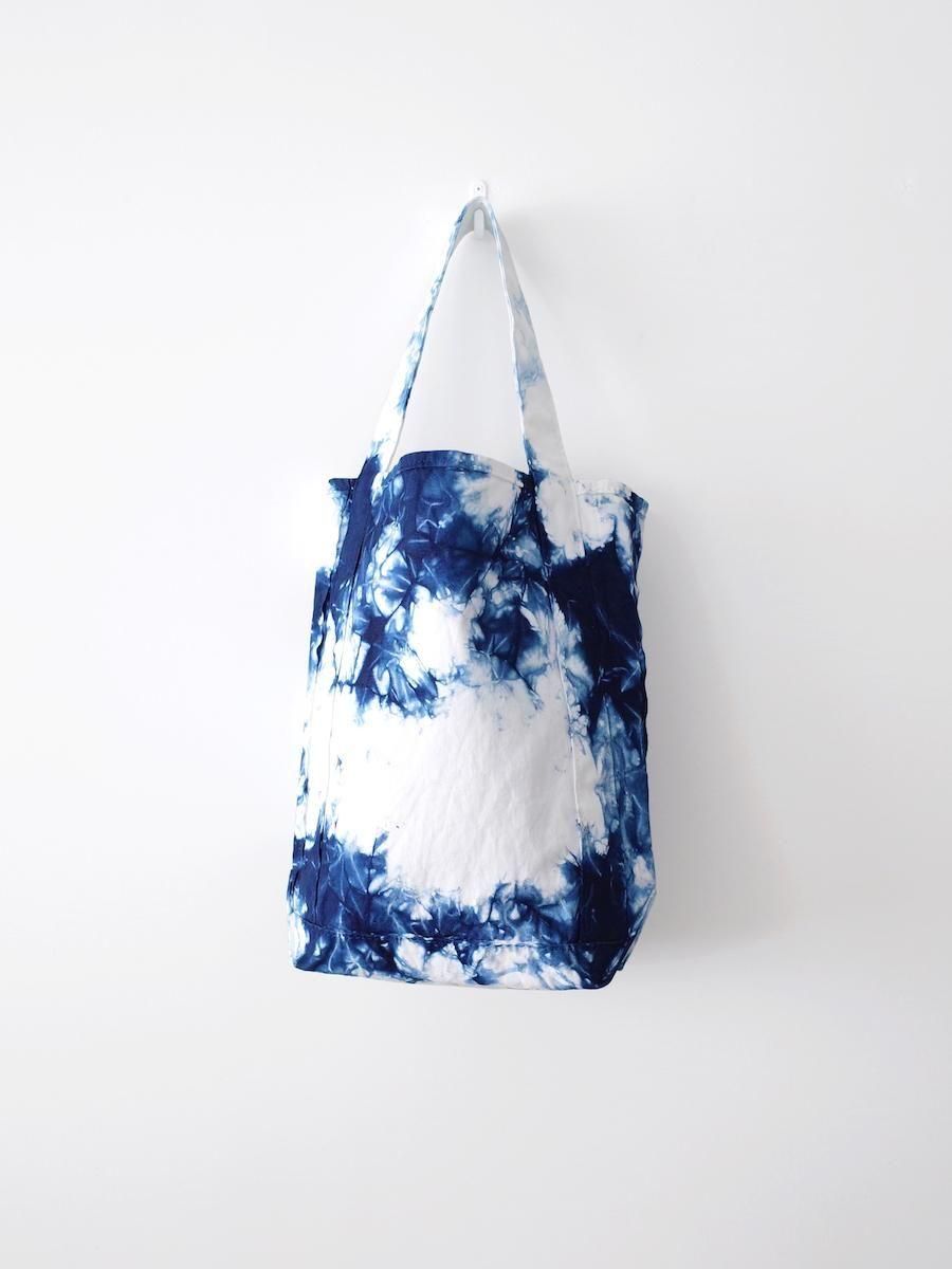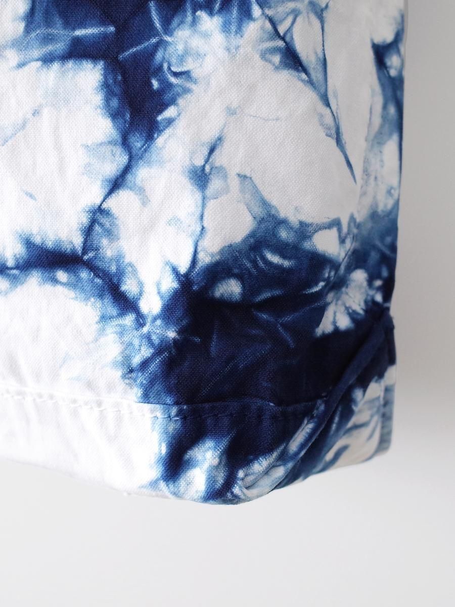 バゲットトートは6号キャンバスを使用したものが多いですが、こちらはシャトル織機で織られた11号キャンバスを使用し、さらにインディゴで絞り染めを施しています。手作業で染めと洗いをかけているためひとつひとつ表情が異なり、濃淡のニュアンスが美しく、均一に染められた藍染めとはまた違った魅力があります。