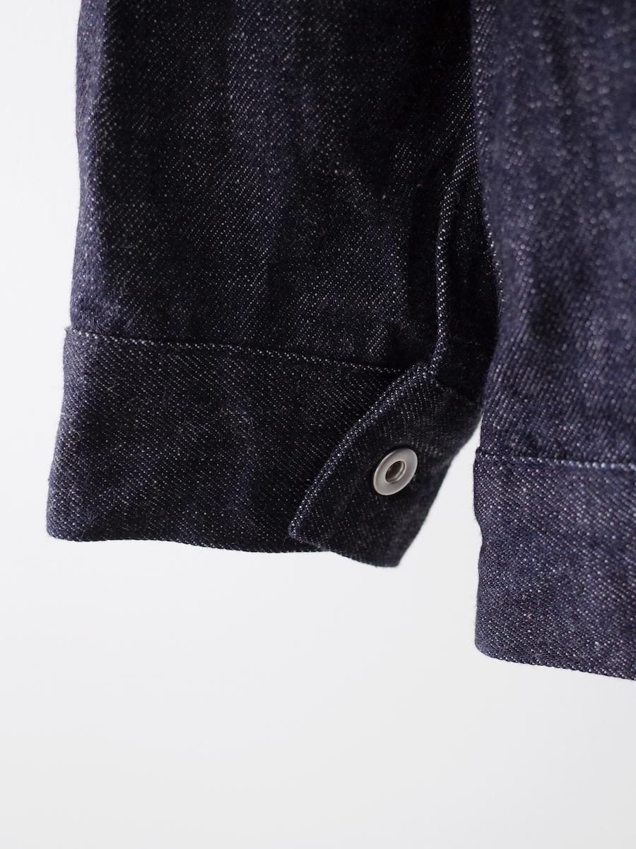 旧式の織機でゆっくりと時間をかけて織り上げた、表情豊かなデニム生地。糸ムラであったり、経糸を強く打ち込まないことで生まれる凹凸感やシボ感が特徴。表面の毛焼き加工を行わず、あえて毛羽感を残したデニム本来の風合いが楽しめる点も魅力です。