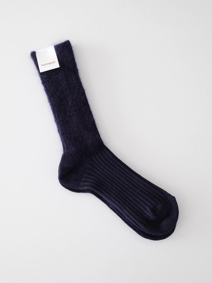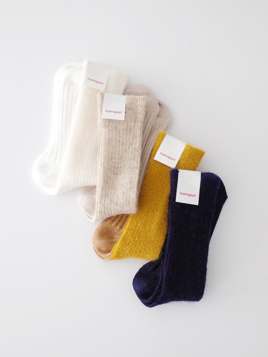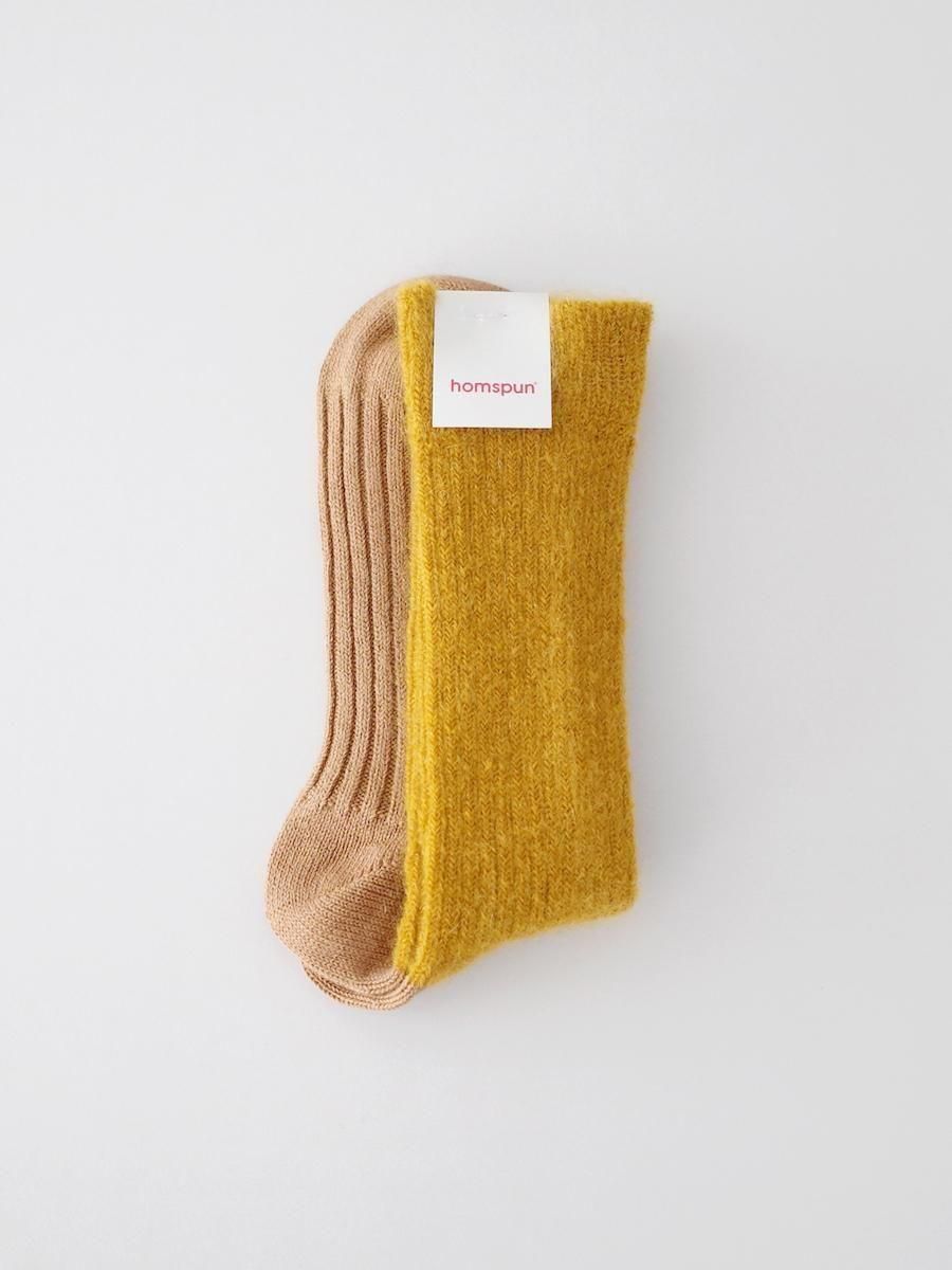 足首から上がモヘア混のふわっとした生地、足首から下がコットンを中心とした肌触りのよい生地でつくられた靴下。